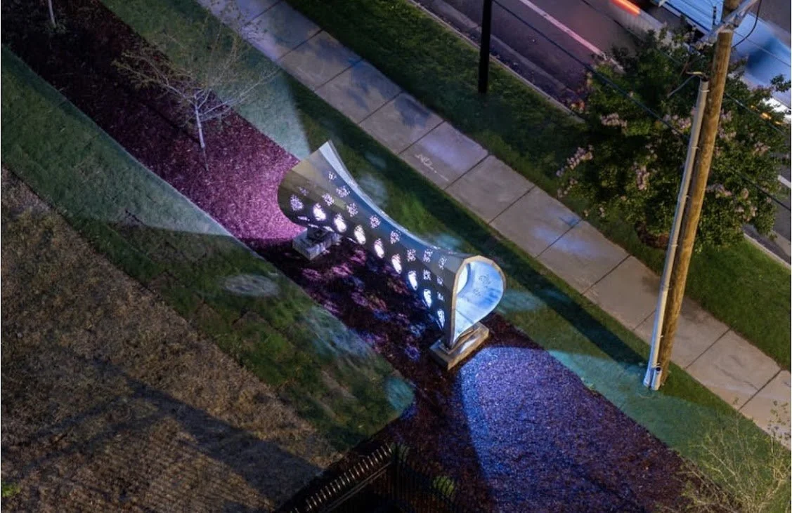 Responder, designed by Blessing Hancock, is a 19ft long, 6 ft wide, and 9 ft tall sculpture stationed in North Carolina outside of Fire Station #45. Designed by Blessing Hancock and fabricated by our Gizmo team, the piece is meant to provide a calming presence at the fire station for both firefighters and the public. At night, LED lights create a ripple pattern that merge together into a cohesive biconical form, an effect inspired by the overlapping communication signals of an effective emergency response system.